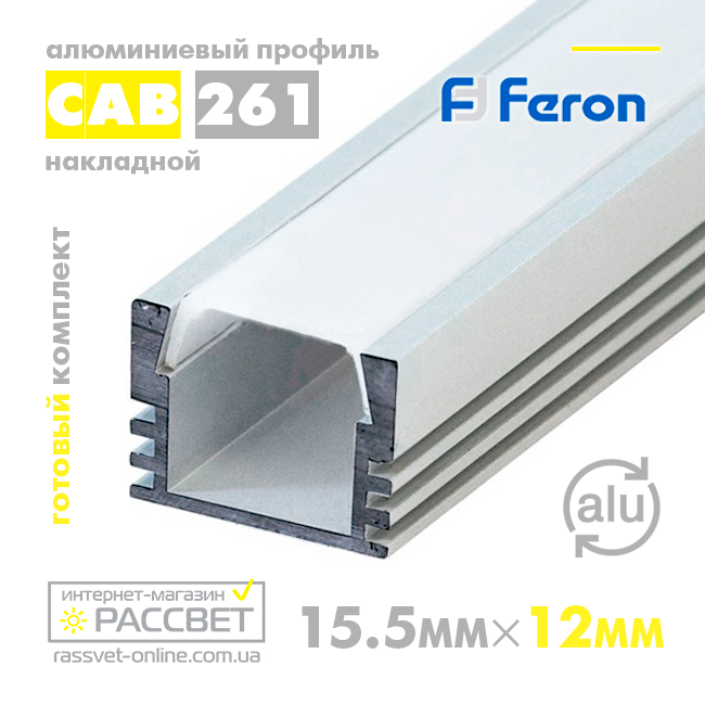 Накладний високий алюмінієвий профіль для світлодіодної стрічки CAB261 от ТМ "Feron" — чудове співвідношення "ціна — якість". Завдяки глибшій посадці стрічки, дає змогу досягти ефекту рівномірного світіння по всій поверхні розсіювача ( тобто світлодіоди не виділяються, і створюється ефект єдиного джерела освітлення, що світиться смуги).